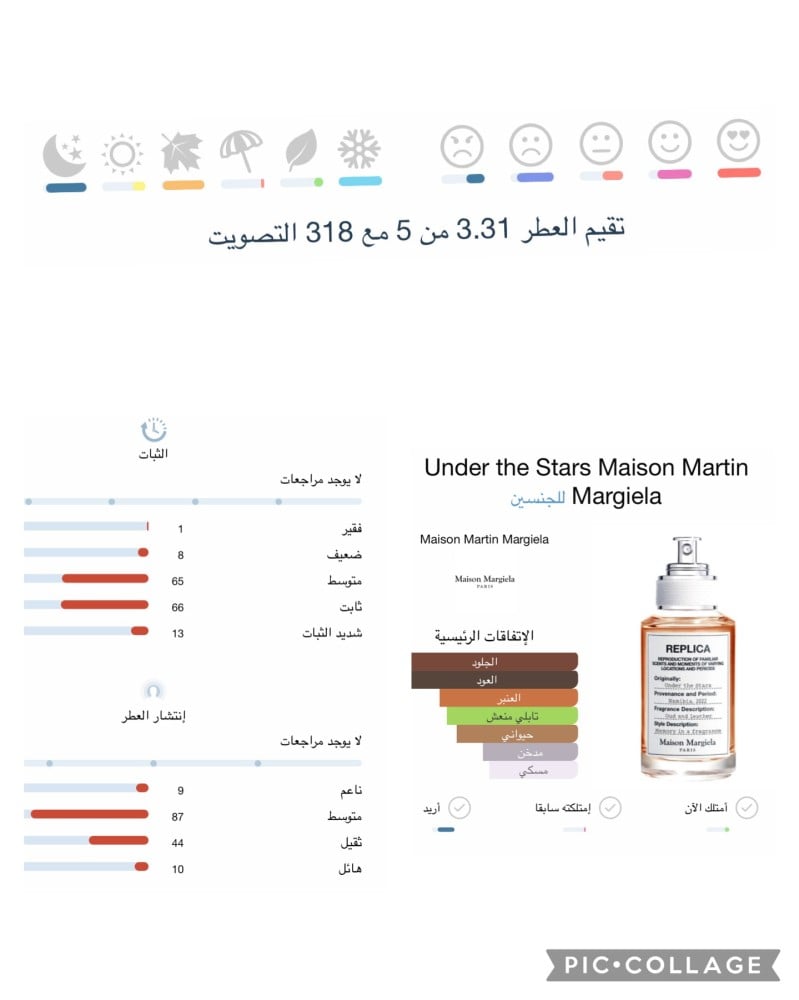 Under the Stars Maison Martin Margiela عطر شرقي - خشبي للجنسين. هذا عطر جديد Under the Stars صدر عام 2023. إفتتاحية العطر الفلفل الأسود; قلب العطر الجلود; قاعدة العطر تتكون من العود و اللابدانوم.