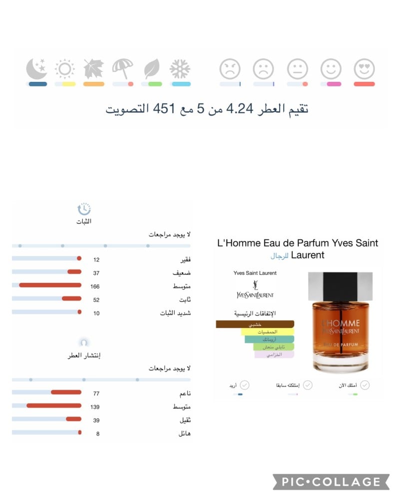omme Eau de Parfum Yves Saint Laurent عطر خشبي - أروماتك للرجال . هذا عطر جديد L'Homme Eau de Parfum صدر عام 2022. إفتتاحية العطر البرتقال المر و البرغموت; قلب العطر الخزامي و إبره الراعي; قاعدة العطر تتكون من الكونياك, البلوط, خشب الأرز و نجيل الهند.