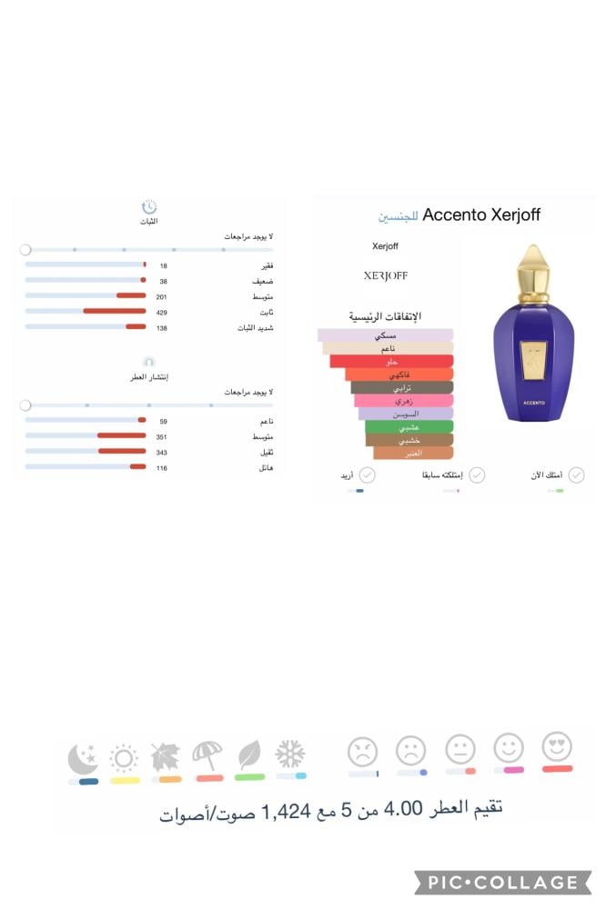 Accento صدر عام 2019. Accento من توقيع Christian Carbonnel و Laura Santander. إفتتاحية العطر الأناناس و الصفير; قلب العطر السوسن, الفلفل الوردي و الياسمين; قاعدة العطر تتكون من المسك, العنبر, نجيل الهند, الفانيليا و الباتشولي.