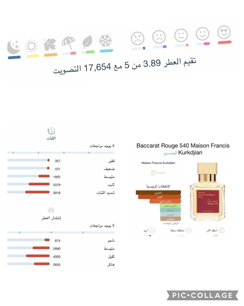 jian . Baccarat Rouge 540 صدر عام 2015. Francis Kurkdjian قام بتوقيع هذا العطر. إفتتاحية العطر الزعفران و الياسمين; قلب العطر خشب العنبر و الآمبرغريس; قاعدة العطر تتكون من أصماغ التنوب و خشب الأرز.