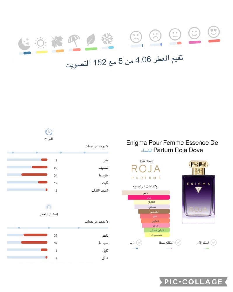 Enigma Pour Femme Essence De Parfum Roja Doveعطر شرقي - زهري للنساء . Enigma Pour Femme Essence De Parfum صدر عام 2021. إفتتاحية العطر البرغموت; قلب العطر ورد ماي, الخوخ, إبره الراعي, الهيلوتروب, الإيلنغ, النيرولي و الياسمين; قاعدة العطر تتكون من المسك, الفانيليا, خشب الصندل, الآمبرغريس, الباتشولي و السوسن