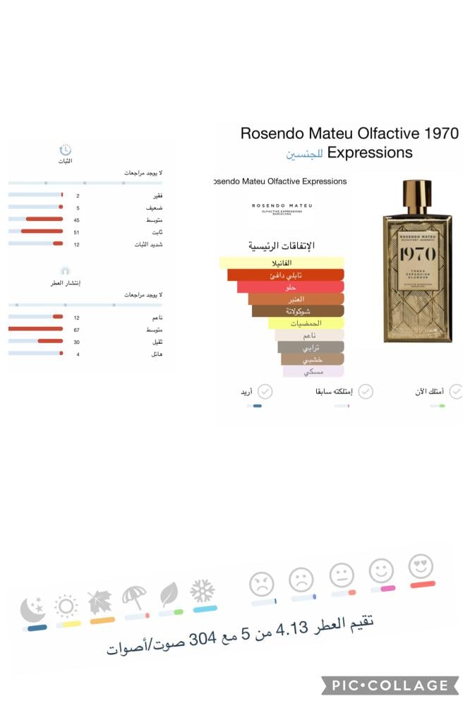 عطر Rosendo Mateu Olfactive Expressions 1970 هو إصدار فاخر تم إطلاقه عام 2023، ويُصنّف كعطر شرقي-تابلي يناسب الجنسين. يتميز بتركيبة غنية ومعقدة تمزج بين الحمضيات، الشوكولاتة، التوابل، الفانيليا، العنبر، والمسك، مما يمنحه طابعًا دافئًا وحسيًا.