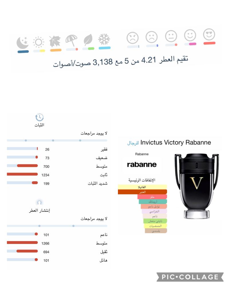 Invictus Victory صدر عام 2021. إفتتاحية العطر الفلفل الوردي و الليمون; قلب العطر اللبان و الخزامي; قاعدة العطر تتكون من الفانيليا, حبوب التونكا و العنبر.