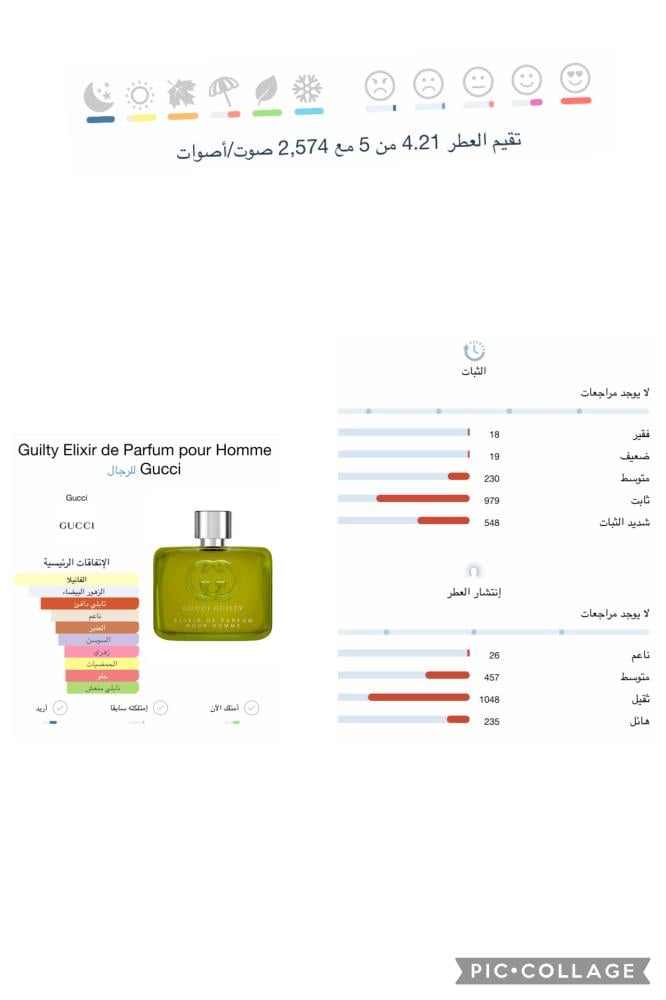 هذا عطر جديد Guilty Elixir de Parfum pour Homme صدر عام 2023. Quentin Bisch قام بتوقيع هذا العطر. إفتتاحية العطر زهر البرتقال, جوزه الطيب و بذور البيمينتو; قلب العطر زهر البرتقال, السوسن و أوسمانثوس; قاعدة العطر تتكون من الفانيليا, Ambrofix™, البنزوين - الجاوي و الباتشولي.