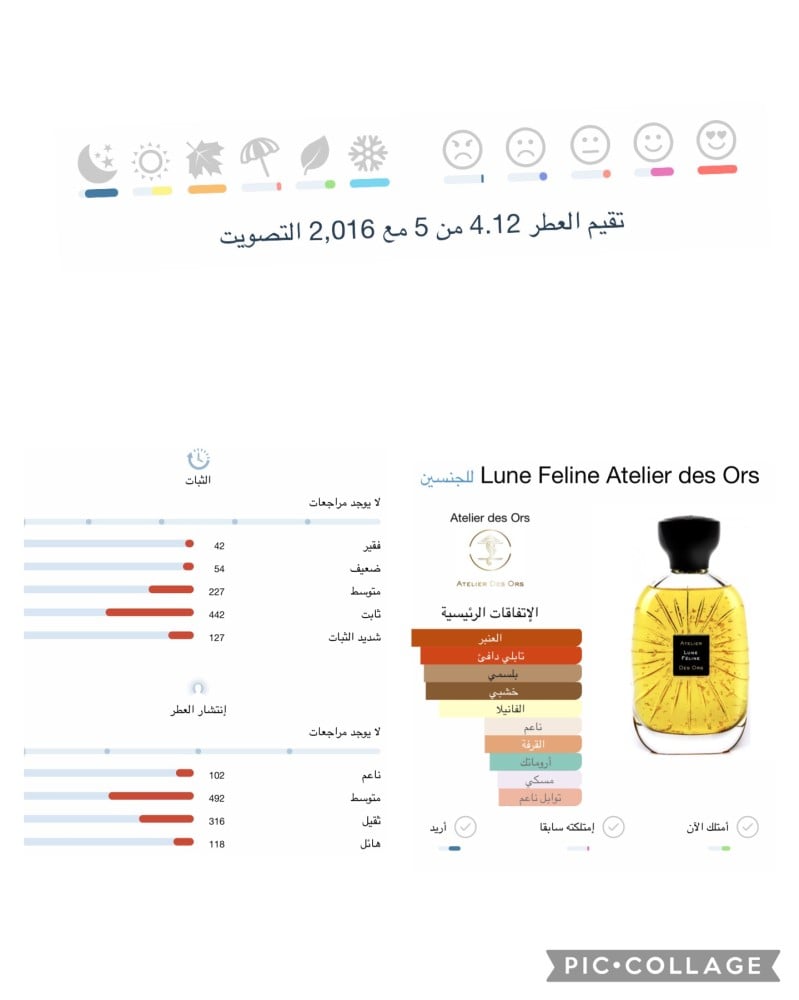 . Atelier Des Ors Lune Feline صدر عام 2015. Marie Salamagne قام بتوقيع هذا العطر. إفتتاحية العطر الهيل, القرفة و الفلفل الوردي; قلب العطر الأخشاب, الآمبرغريس, ستيراكس (العبهر), خشب الأرز و النوتات الخضراء; قاعدة العطر تتكون من فانيليا تاهيتي, بلسم بيرو و المسك.